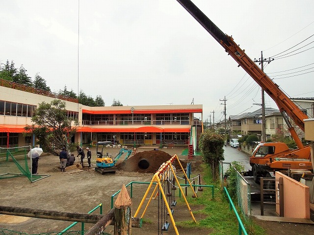 大きなクレーン車で園庭の中に降ろし、植えるための穴を掘り、つき山の赤土も運び入れます。![]()