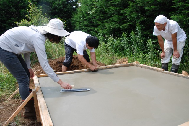 流し込んだセメントをみんなで左官作業です。子どもたちも大人たちもみんなで表面をきれいにします。