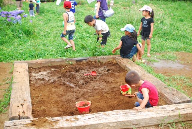 普段食べているものがどうやってできるのかを知るきっかけや、自分たちでつくったものを食べる体験の場となることを願って、ちいさな畑と花壇をつくりました。さらに、土で自由に遊べるどろんこ広場も完成。